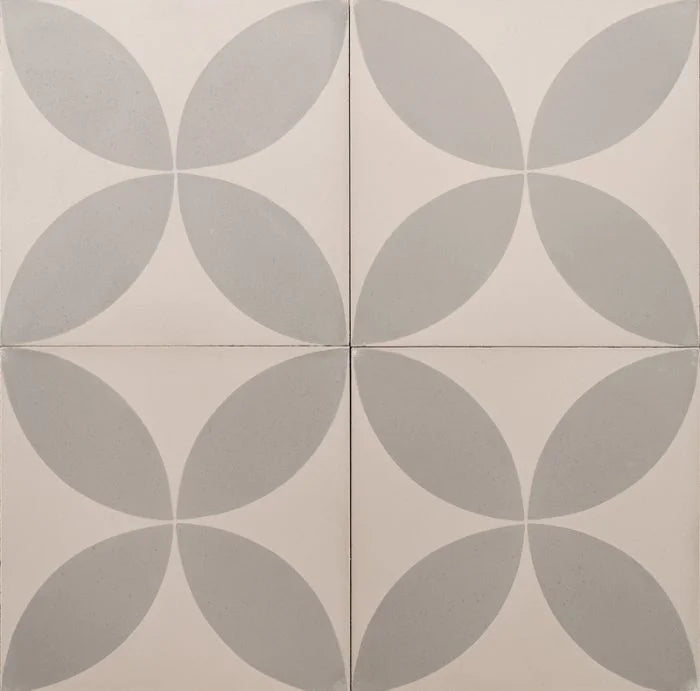Grey on Grey Fleur Tile. Light grey tile with big dark grey petal shapes that make up a circular pattern. Grey on Grey Fleur Tile, to make a statement in any interior.