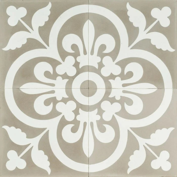 Grey Royal Tile. A cement grey tile with a thick white design that cascades out with a vibrant flower in the centre. Grey Royal for any interior.