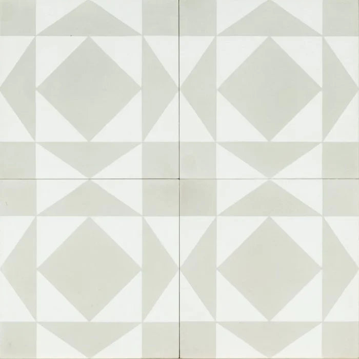 Grey Urban Retro Tile. A white coloured tile with mid grey triangle shapes that make a diamond cascading out. Grey Urban Retro for any interior.