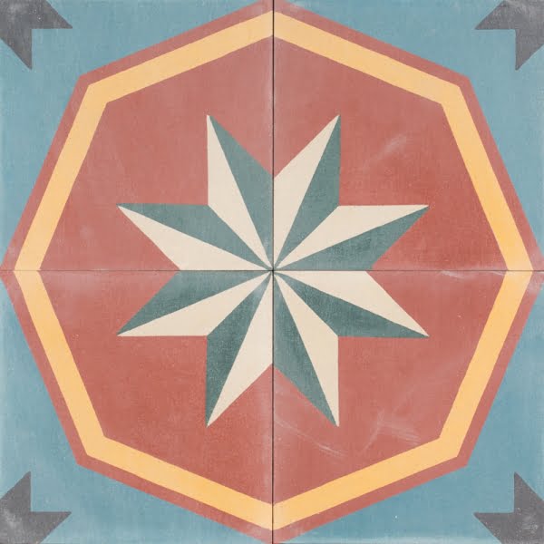 India Old Effect Tile. Smokey blue, brick red and gold with pops of charcoal and white makes a powerful showcase wherever this tile is laid. The star in the centre elevates the colours and the appeal of India Old Effect. With its old effect this characteristic� design comes to life in a new way, grand whichever way it is looked upon. Bring colour to any interior with India Old Effect Tile.