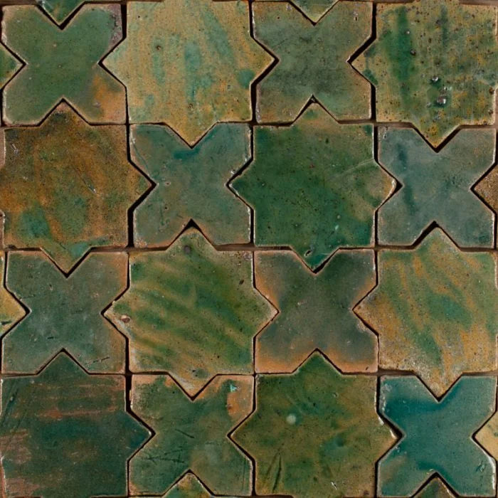 Jade Glossy Estrella. Shapes of stars and crosses add depth and intrigue to these mixed blue glazed tiles. The Jade Glossy Estrella enable you to have the unique star and cross pattern using only one colour, Jade! For samples you will receive one of each (star and cross).