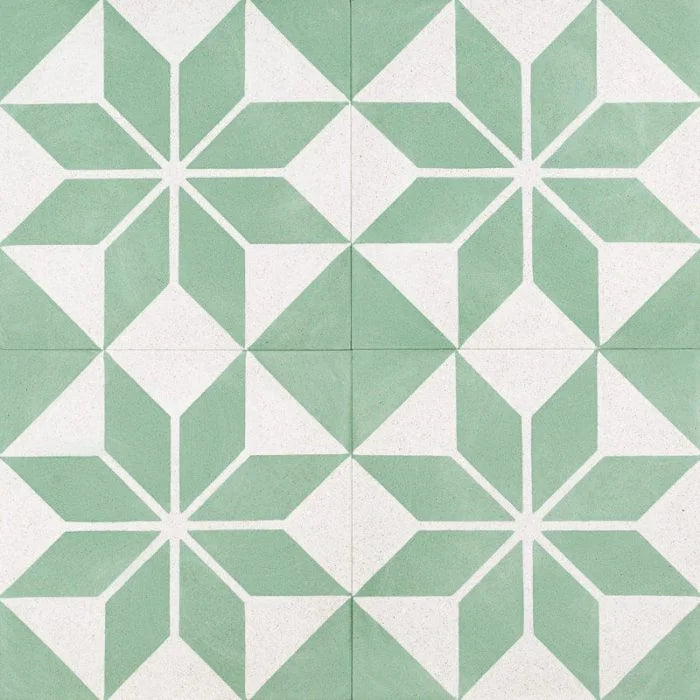 Jade Star Tile. Beautiful jade-green brings life to this tile, complimented with white. Large stylised stars bring energy. Jade Star for any interior.