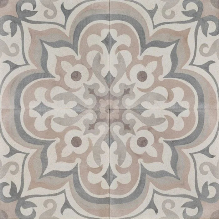 Jaffa Tile. Beautiful earthy colours with a balance of latte, chocolate, charcoal and a muted grey. A gorgeous lotus inspired pattern that flourishes from the centre of the tiles with an added antique look. The Jaffa Tile, with its spanish inspired beauty, will exhilarate in any interior.