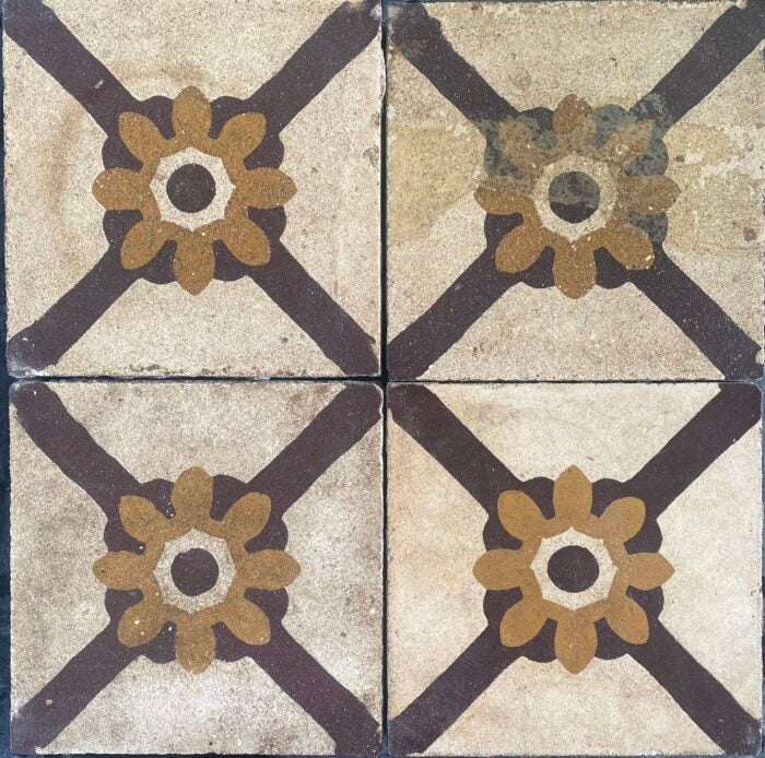 Lagertha Flower, a timeless beauty boasting bold mustard yellow flowers and rich earth brown detailing. Our Antique encaustic tiles are salvaged with hundreds of years of history held in every tile. A truly unique addition to any space.