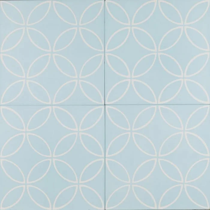 Light Blue Tango Tile. A light blue tile with a thin white petal shape design that brings energy to the tile. Light Blue Tango to compliment any interior.
