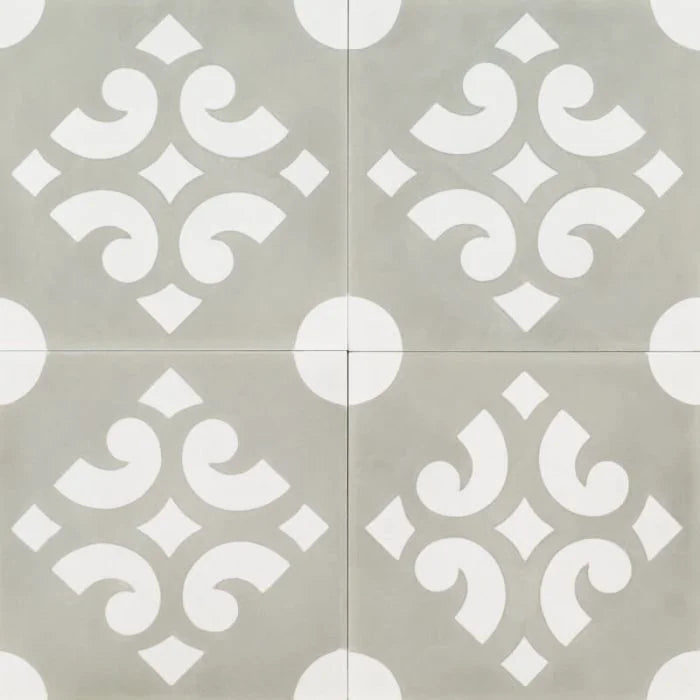 Light Grey Spanish Villa Tile. A light grey softens this tile, with a Spain inspired white diamond pattern. Light Grey Spanish Villa for any interior.