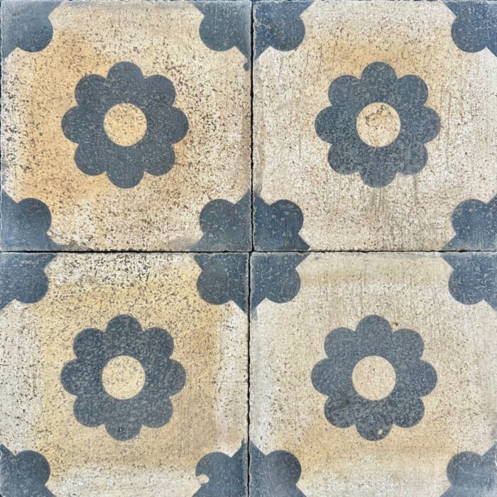 Little Black Flower Antique Tile. A timeless piece that has come from a small village near the Nile that will bring a story to your space. A simple black flower centered on a white background will add the right amount of detail and depth while still maintaining a simplicity. Little Black Flower Antique for any interior or exterior as a floor, wall or feature tile.