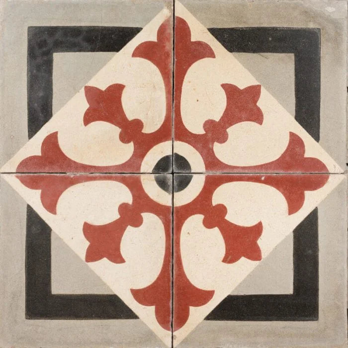 Lord Antique Tile. Cement grey tile with a white diamond filled with a burnt red, a black frame. Lord Antique to compliment any interior.
