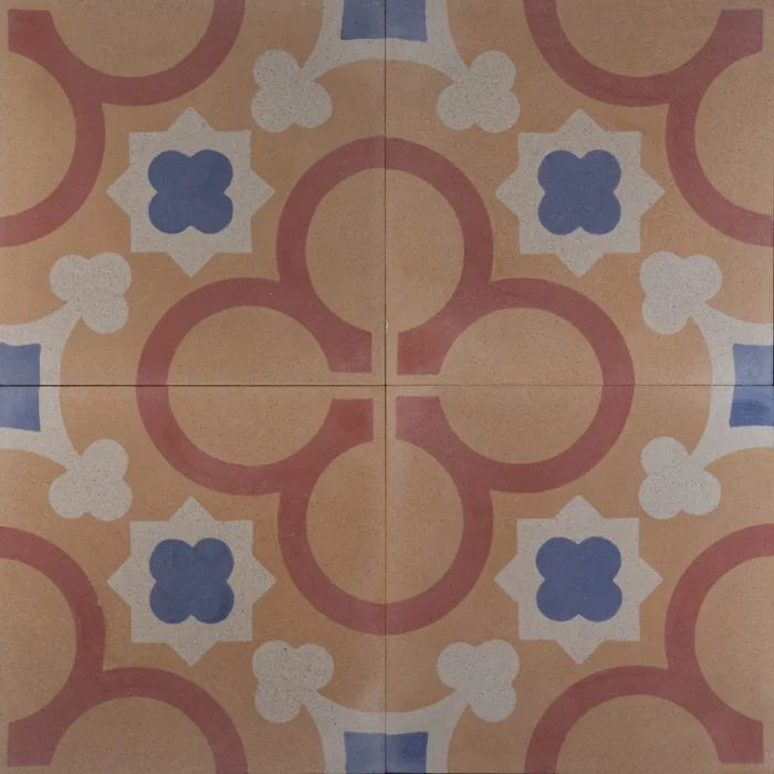 Madrid Tile. Captivate with this age old design, taken from an antique tile that we couldn’t get enough of therefore we had to recreate it. Stunning soft terracotta is complimented beautifully with the colours of the red clover, bordered with a navy and white pattern. The colours, the design are all perfect for any interior or exterior, the Madrid Tile.