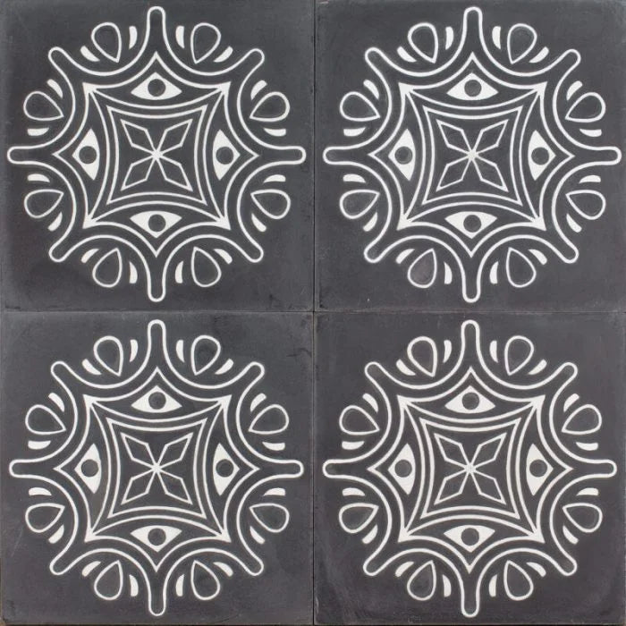 Maharani Tile. A deep charcoal tile with a detailed white pattern in the centre that cascades out in a vibrant way. Maharani Tile for any interior.