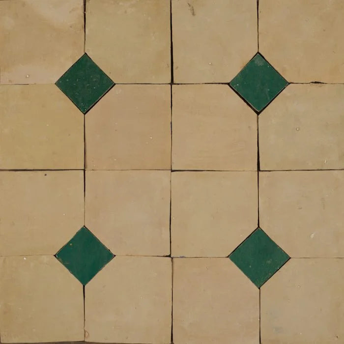 Marrakesh Delight. When terracotta meets zellige there is wow and the stunning Marrakesh Delight is nothing� but wow! Raw square terracotta meets a very special emerald green glazed zellige diamond, this design will make jaws drop. Suited to feature, outdoor, indoor installations, this tile compilation is diverse and ready to make a statement. Bring Morocco to your home with Marrakesh Delight. (tiles provided on mesh for easy installation )