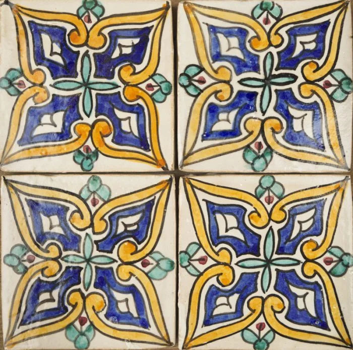 Mi Casa Tile. Royal blue, emerald green and gold with a white border compliments the floral star shape that centres the tile. A tile to bring zing to any interior, the Mi Casa Tile.