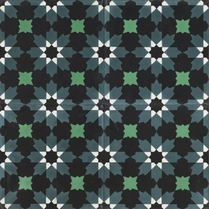 Midnight Blue Azule tile. Tones of black, white, smokey blue with splashes of jade for this exotic tile. Midnight Blue Azule to compliment any interior.