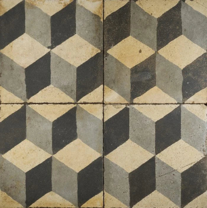 Mini Cubist Antique Tile. Be bold and brave, add strength and power to any room with the effects of mini cubes stacked against each other in cooling grey and charcoals. Let these antique tiles will take you on an ancient journey of wonder and awe. This age old tile meets modern with its pattern and offers nothing but a grand impact. Full of character the Mini Cubist Antique tile is over 100 years old and will fill any room with character. In great condition, the Mini Cubist Antique tile is perfect for any interior and outdoor installations.