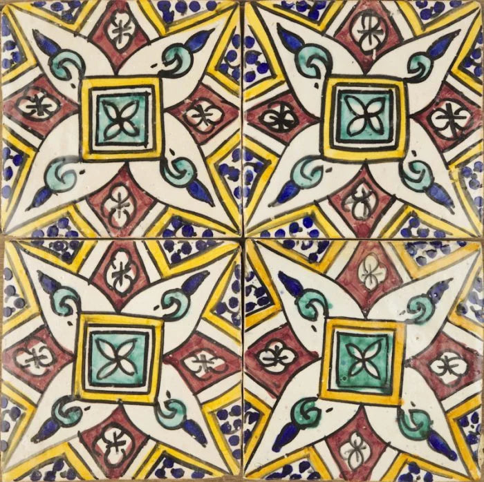 Mini Zellige Flower Tile. A burst of colours highlights the energy of this tile, a jagged flower coming from the inside out. To bring zest and joy to any interior, the Mini Zellige Flower Tile.