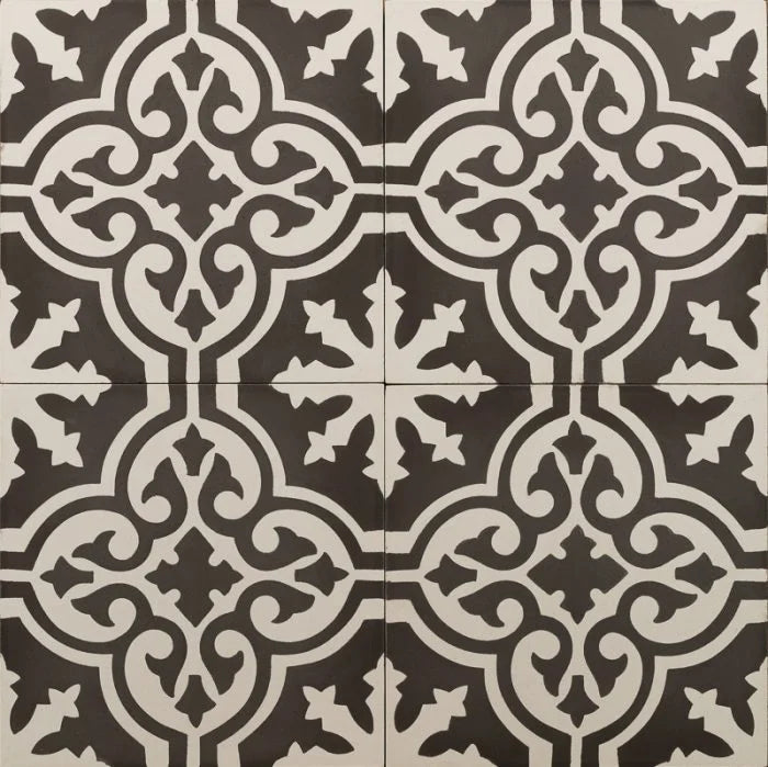 Moroccan Bazaar Tile. A bold tile with a bright pattern made up of black and white. The pattern makes clovers and flourishes. Moroccan Bazaar to make a statement in any interior.