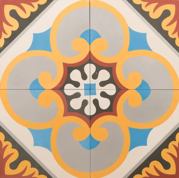 Moroccan Blue Tile. A brightly coloured tile made up of grey, blue, yellow and maroon with splashes of charcoal. A vibrant pattern cascading from the inside out. Moroccan Blue Tile to bring life to any interior.