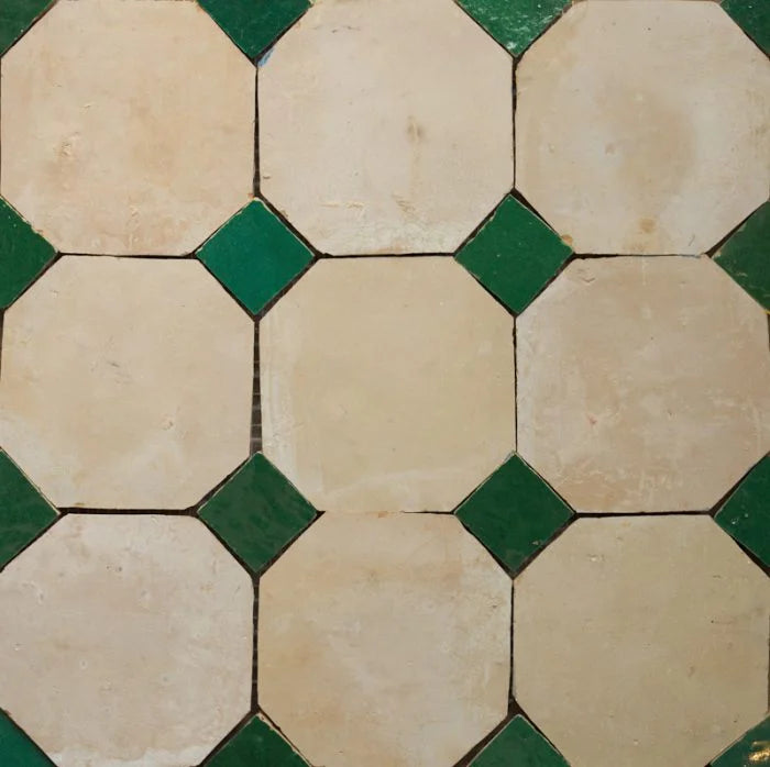 Moroccan Courtyard. Bring the atmospheric warmth and good times of Morocco to your home with the compatible rawness of terracotta and glazed zellige tiles. If it’s a Moroccan Courtyard vibe you are seeking look no further. The ambience of the octagon terracotta moulded with stunning emerald green zellige diamond tiles makes this compilation nothing but breathtaking! Moroccan Courtyard for any interior or exterior setting. (tiles are supplied on mesh for easy installation)