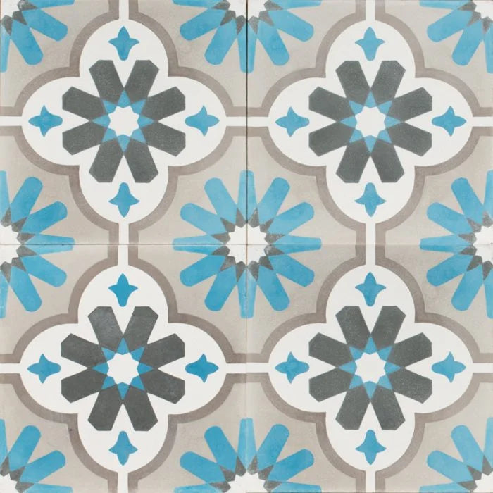 Moroccan Flower Tile. Greys, charcoal and white with splashes of blue light up this tile, with flowers patterns and frames. Moroccan Flower for any interior.