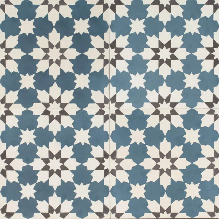 My Azule Tile. A bold tile inspired by the essence of Morocco, the smokey blue with white detailed star shaped flowers and pops of charcoal bring zest and full flavours of Morocco to any interior. My Azule Tile to bring life to any interior.