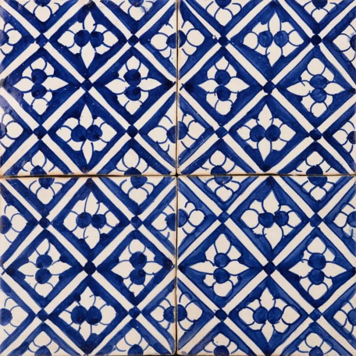 Navy Lily Glazed Tile. White and deep navy coloured tile that makes a detailed checkered pattern with flowers in between. Navy Lily Glazed for any interior.
