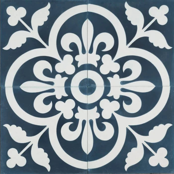 Navy Royal Tile. A deep sea navy colour brings depth to this tile, a thick white flower centres the tile and cascades out. Navy Royal for any interior.