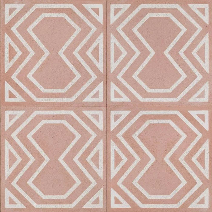 Our Nazca tile has simple yet elegant Peruvian graphic shapes in white on a muted nude, salmon coloured background. Nazca tile is perfect as an indoor or outdoor tile.