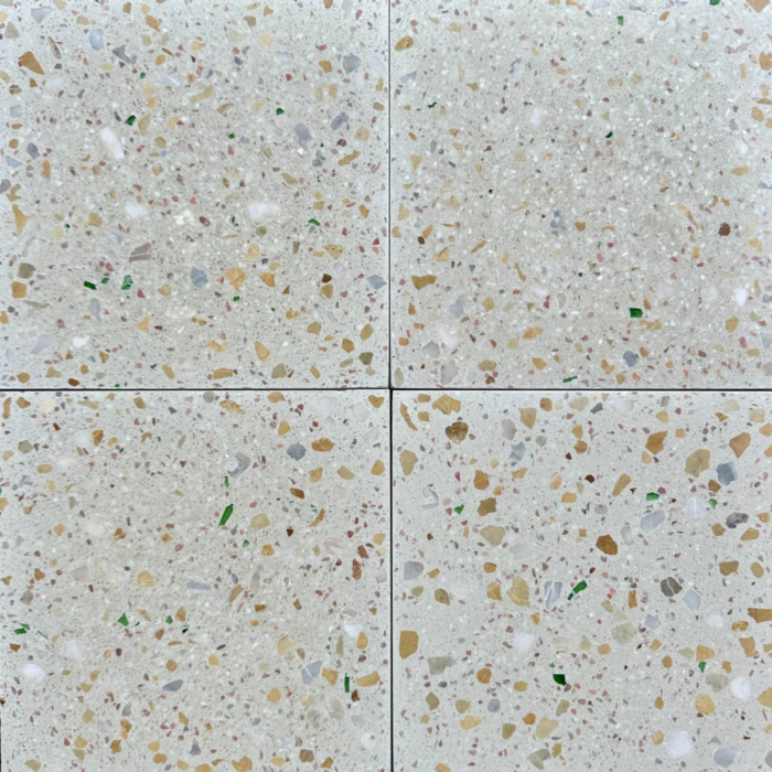 Nougat Terrazzo tile. This unique handmade tile will bring life and colour to any space with the beautiful mix of earthy colours with a hint of emerald green. The classic sparkle of terrazzo will add brightness and depth to any space. Nougat Terrazzo tile for any interior or exterior space. Suited to any wet areas once sealed.