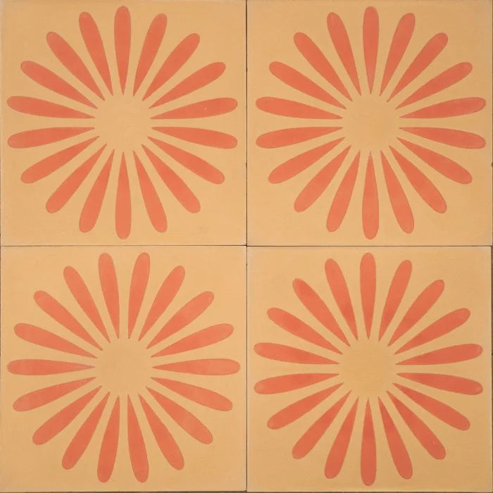 Ochre Flower Tile. Ochre and burnt orange make up a lovely tile adorned with a bursting flower in the centre. The Ochre Flower Tie to bring life to any interior.