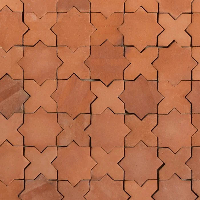 Petite Estrella Tile. A gorgeous combination of terracotta stars and crosses making a vibrant pattern. Petite Estrella terracotta tiles will add unique flair and with the red tones of the terracotta bringing warmth to any interior. When ordering samples you will receive one of each star and cross as a set.