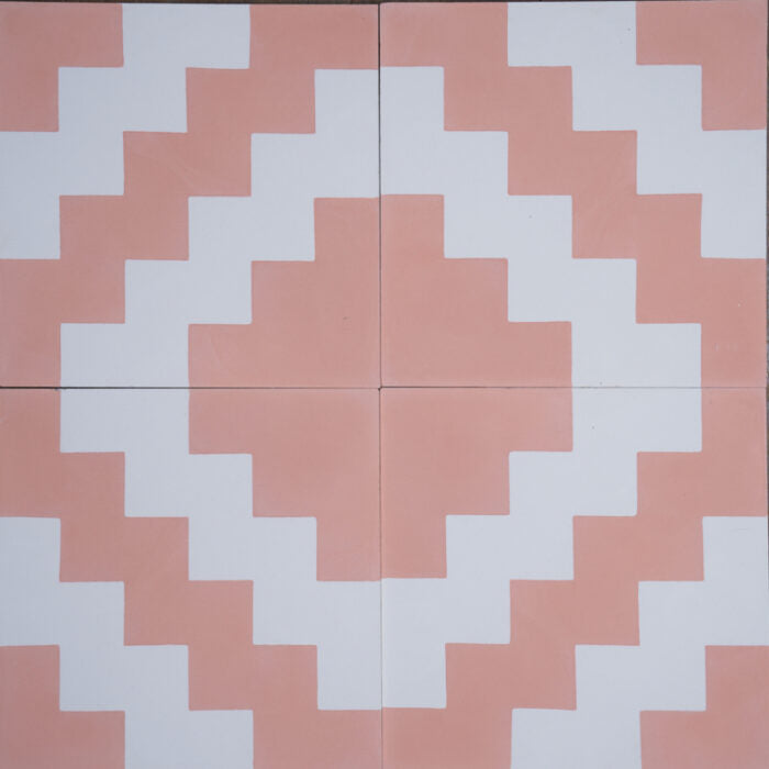 Pink Acapulco Tile. A warm terracotta pink shade brings warmth to this vibrant tile. White zig-zags vibrate throughout. Pink Acapulco to brighten any interior or exterior.