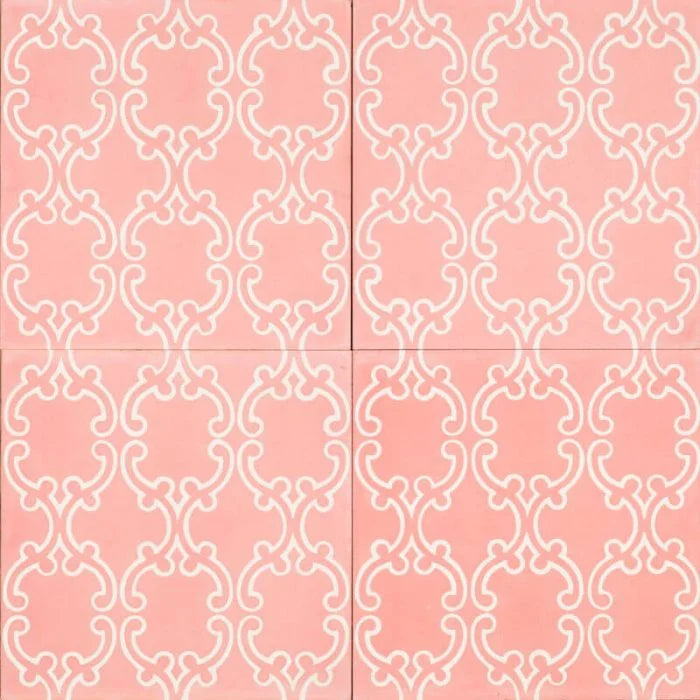 Pink Anatalya Tile. Peachy pink tones compliment the white stylistic chain-like pattern on this tile. Pink Anatalya to bring energy to any interior.
