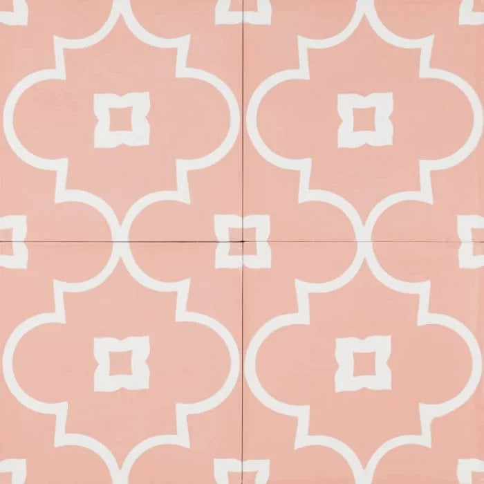 Pink Annalise Tile. Hues of peach and pinks colours this tile and compliment the gentle white flowers and frames. Pink Annalise to brighten up any interior.