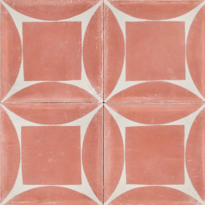 Pink Cuzco Tile. The beautiful colours of dusty pink combined with white geometric lines that create a flower, bring warmth and an essence of serenity. On mass the shapes become vibrant bringing the Pink Cuzco alive. A timeless design that laid indoors or out, and in any interior setting will highlight in awe, the Pink Cuzco for any installation.