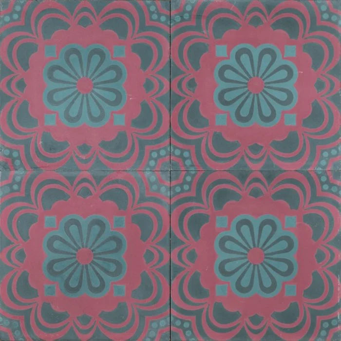 Pink Lisbon Tile. Vibrant colours of teal, smokey blue and deep cranberry compliment the flower in the middle. Pink Lisbon to bring life to any interior.