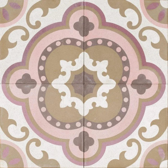 Pink Mandala Tile. Shades of pinks and browns inspire the beautiful mandala shape that centres this tile formation. Pink Mandala to honour any interior.