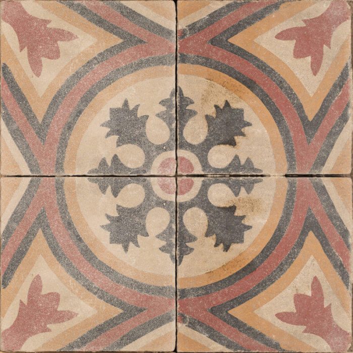 Red Chateau Antique Tile. Muted maroon, ochre with black detailing brings drama to this tile. Red Chateau for any interior.