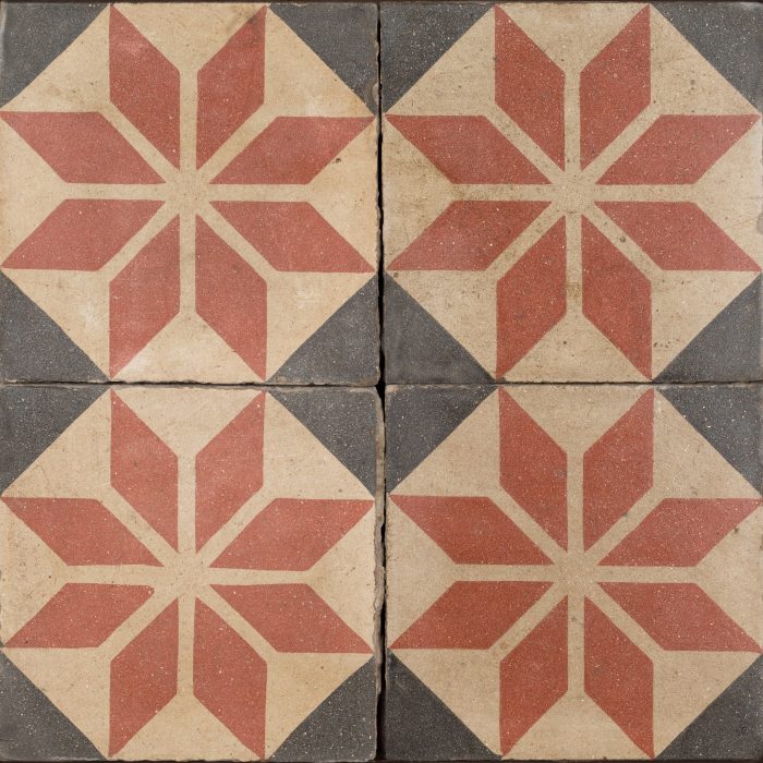 Red Crystal Antique Tile. A beautiful vintage looking tile. Chalky and raw, coloured off-white with red diamonds that form a star and black borders. A tile to bring drama to any interior, the Red Crystal Antique Tile.