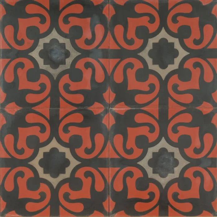 Red Exotic Flower Tile. A deep desert-red tile with charcoal exotic flowers and frames that make up a detailed pattern. Red Exotic Flower for any interior.