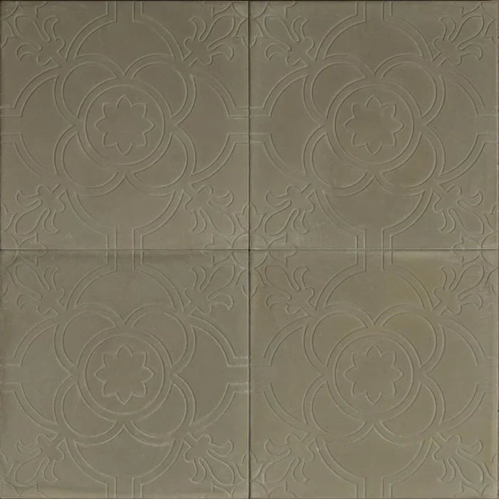 Royal Moss Tile. A new unique tile in a beautiful olive green, etched with a stunning� flower pattern for a subtle royal,� sophisticated feel. Perfect for any interior or exterior.