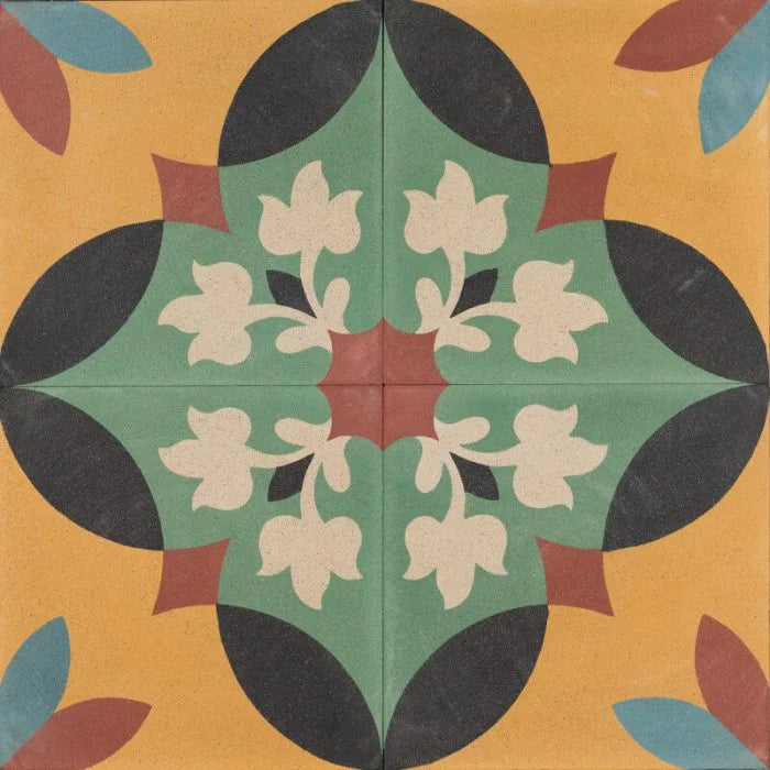 San Cristobal Tile. Gorgeous contrasting colours of sunset gold, jade, charcoal, teal and warm brown bring feeling to the San Cristobal Reproduction Tile.