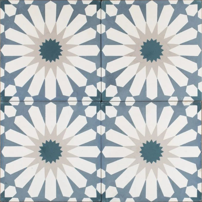 Smokey Blue Daisy Tile. The stunning colours of smokey blue, soft white and a little beige is a striking element to this modern, playful daisy design. A wholesome circular rhythm adds to the element of this funky design. An absolute perfect fit to any installation within your home that will not disappoint. Smokey Blue Daisy for any interior.
