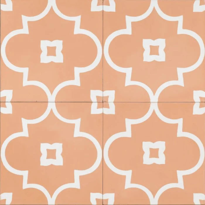 Baby Salmon Annalise Tile. A light peachy salmon colours this tile, with white flower patterns and diamond frames. Baby Salmon Annalise for any interior.