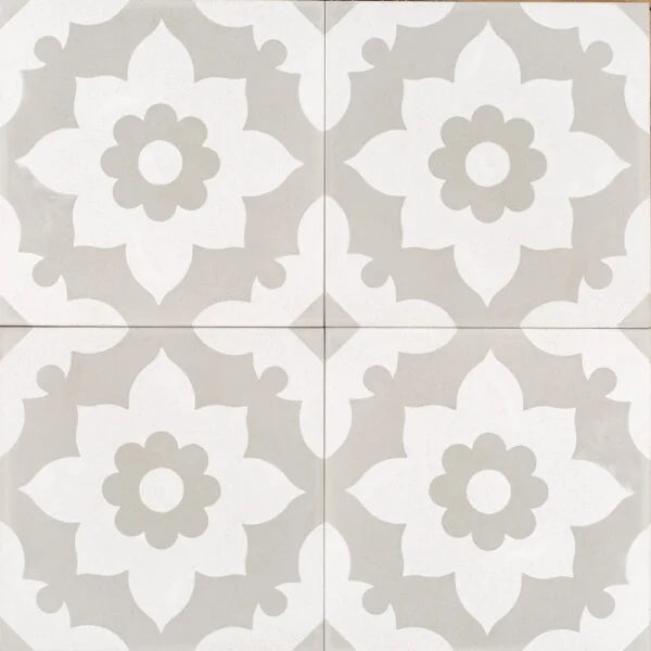 Sol Old Effect Tile. Simple grey and white tile with an antique finish that creates a look of beautiful flowers that cascade out. Sol Old Effect to bring life to any interior.
