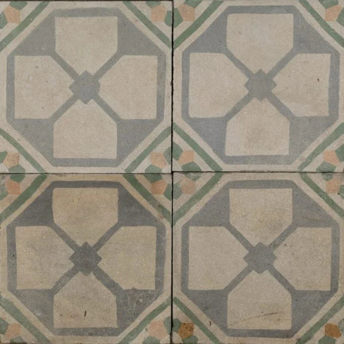 Steel Clover Antique Tile. A muted tile with dark grey and pops of green and orange to bring depth to the strong pattern. Steel Clover for any interior.