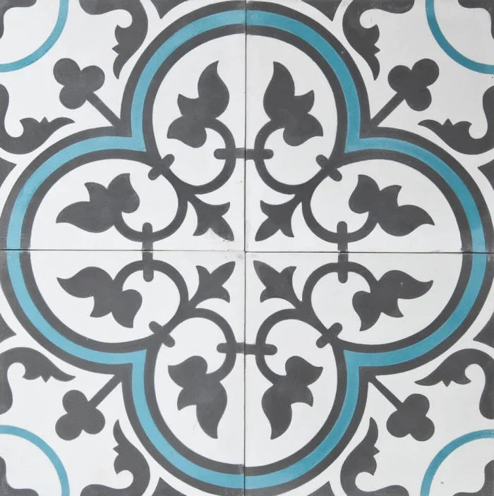 Teal Clover Tile. Complimenting colours of striking blue, white and dark grey with an intriguing framed clover pattern. Teal Clover for any interior.
