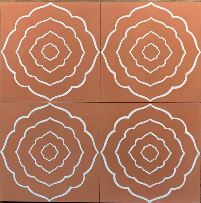 Terracotta Dreaming Tile. A terracotta coloured tile with white detailed flower shapes. Terracotta Dreaming to compliment any interior.