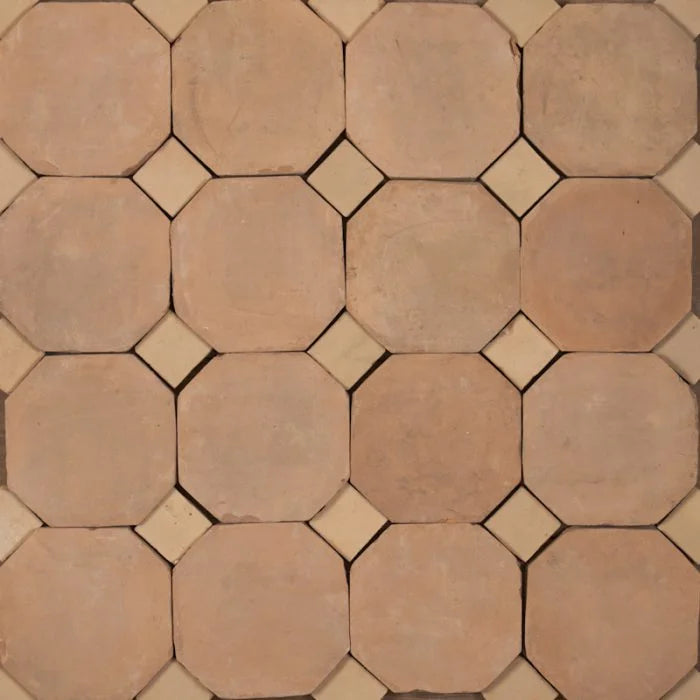 Terracotta Octogon. Bring the earthy, warm textures of this beautiful terracotta tile into any interior or exterior. Set worlds apart with this design as it makes its impact wherever installed. The loved Octagon shape is pieced together with the divine mini diamond terracotta tiles, two parts to this design that add statement and flair. Unique and inspiring, Terracotta Octagon for any interior. We love this tile for outdoor patio areas, bathrooms, laundries, walls and floors. Our terracotta installation guide is provided for sealing tricks and tips. Hand made with love in Morocco.