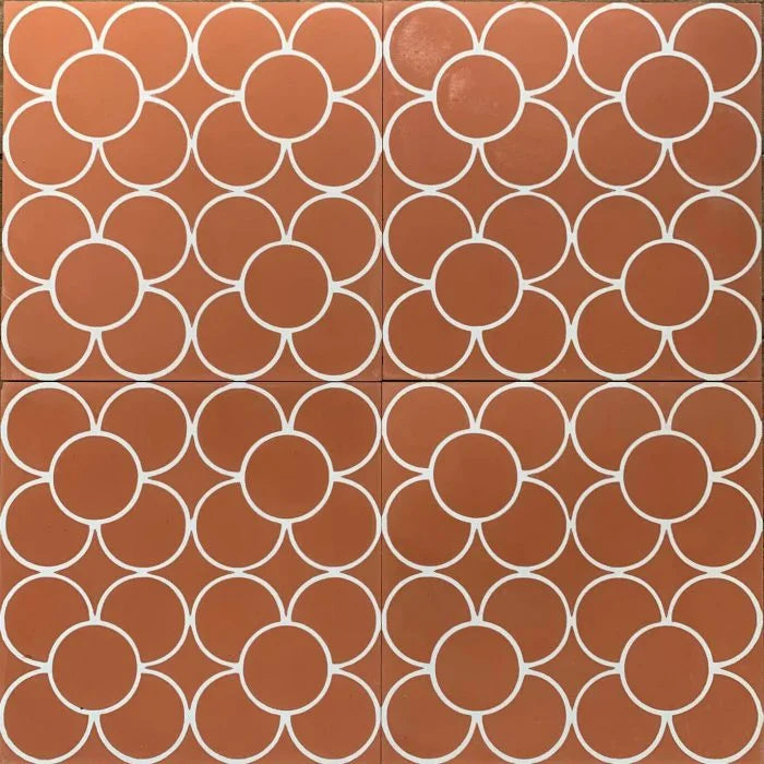 Terracotta Petite Daisies tile. Thin white daisies placed on a terracotta coloured background. Terracotta Petite Daisies to brighten up any interior.