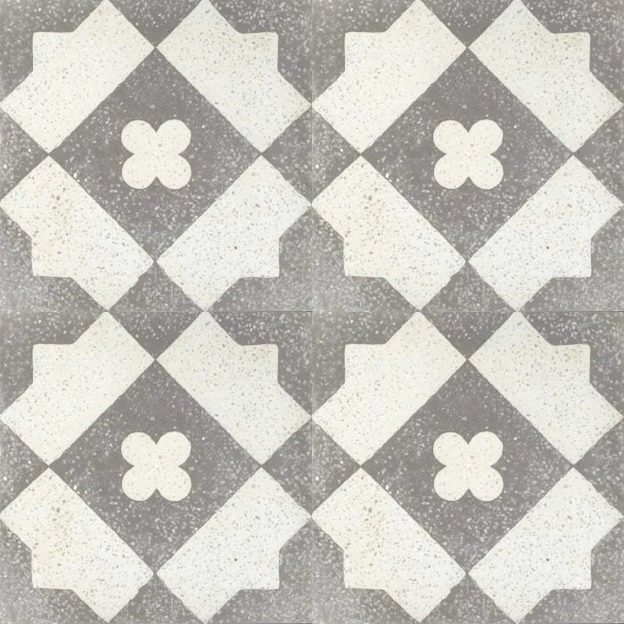 Terrazzo Flower Tile. A tile with style, terrazzo flecked grey with bold white star shapes and flowers. Terrazzo Flower Tile, to bring life to any interior.